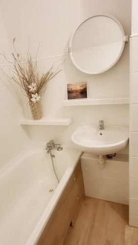 Mieszkanie składa się z trzech rozkładowych pokoi, oddzielnej, widnej kuchni, łazienki, wc i przedpokoju.