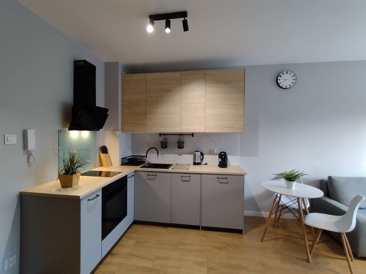 - salonu z aneksem kuchennym (wyposażenie: szafki kuchenne, lodówka, płyta indukcyjna, zmywarka, piekarnik),