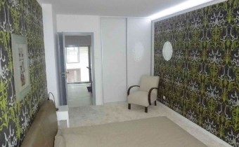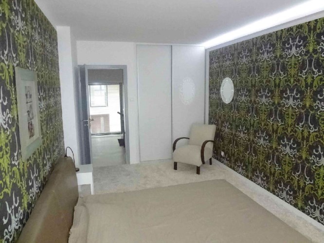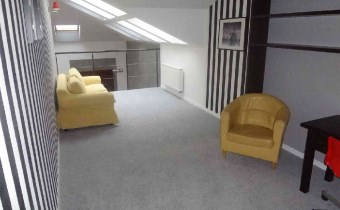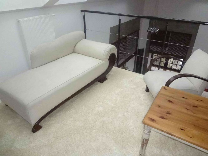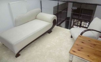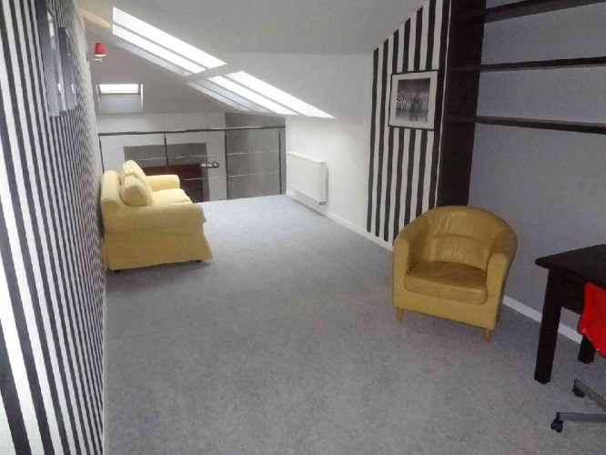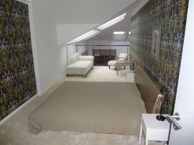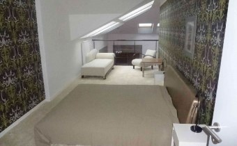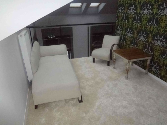 na podłodze wykładzina, szafa typu Komandor z drzwiami przesuwnymi, okna dachowe od strony wschodniej (zainstalowane rolety przeciwsłoneczne), łóżko podwójne z 2 toaletkami, szezląg, 2 fotele, ława,