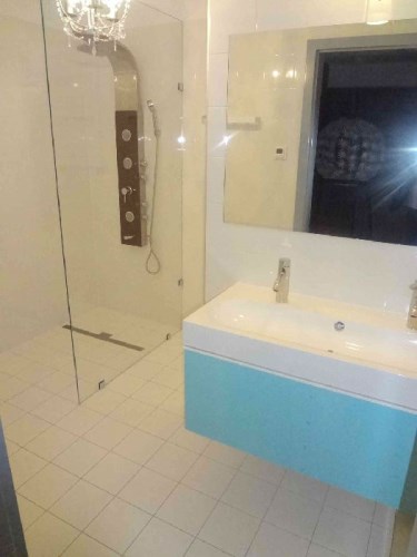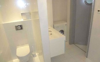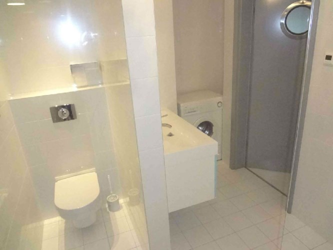 umywalka z lustrem z oświetleniem, sedes, prysznic z deszczownią, pralka,