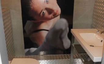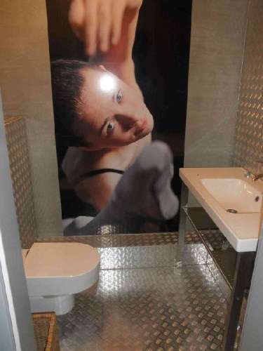 oryginalne wykończenie, płyty aluminiowe na podłodze i na ścianach, umywalka, sedes typu Geberit,