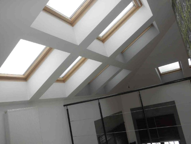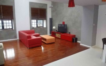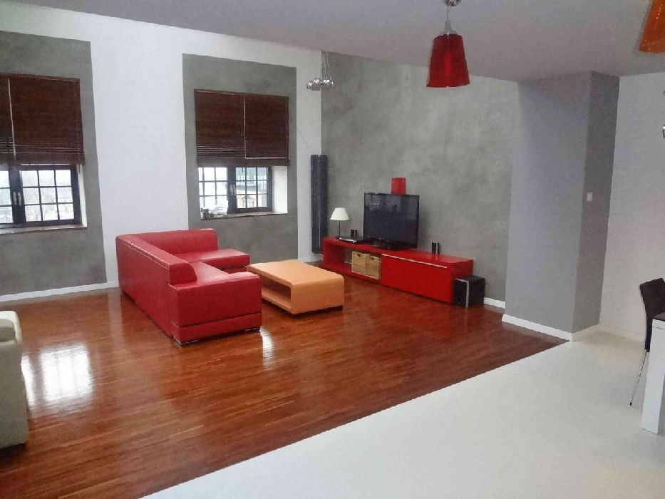 olbrzymi salon, który w najwyższym punkcie ma 6m wysokości, duże okna typu witryna bardzo dobrze doświetlające całą powierzchnię (dodatkowo okna dachowe), na podłodze parkiet, w salonie skórzany komplet wypoczynkowy (narożnik + ława skórzana), szezląg, szafka pod telewizory, telewizor 42", zestaw kina domowego,