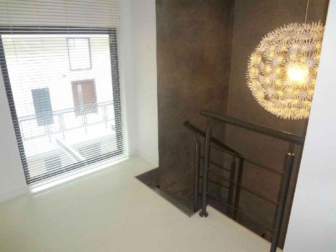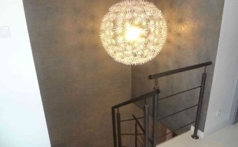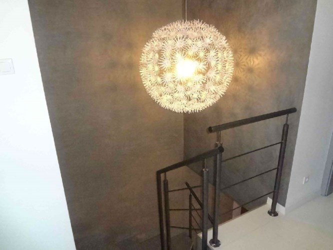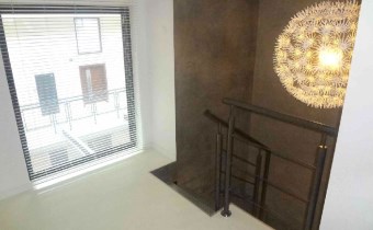 na podłodze w salonie parkiet, w holu wejściowym gres szkliwiony, w sypialniach na antresoli wykładziny, terakota w łazience na górze, w łazience na dołu oryginalne wykończenie z blachy aluminiowej, na ścianach gładzie gipsowe, okna dachowe drewniane, całość bardzo gustownie wykończona.